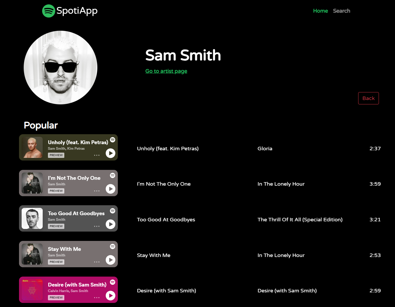 - SpotiApp- Embark on a musical journey like never before with SpotiApp, a cutting-edge web application meticulously developed. Seamlessly integrated with the Spotify API, SpotiApp empowers you to explore the latest music releases, delve into artist profiles, and discover the sounds that resonate with your soul.